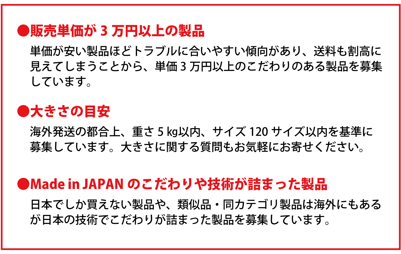 お問い合わせをいただく製品全てを取扱いたいのはやまやまですが、基本的に以下の基準にて募集しています。